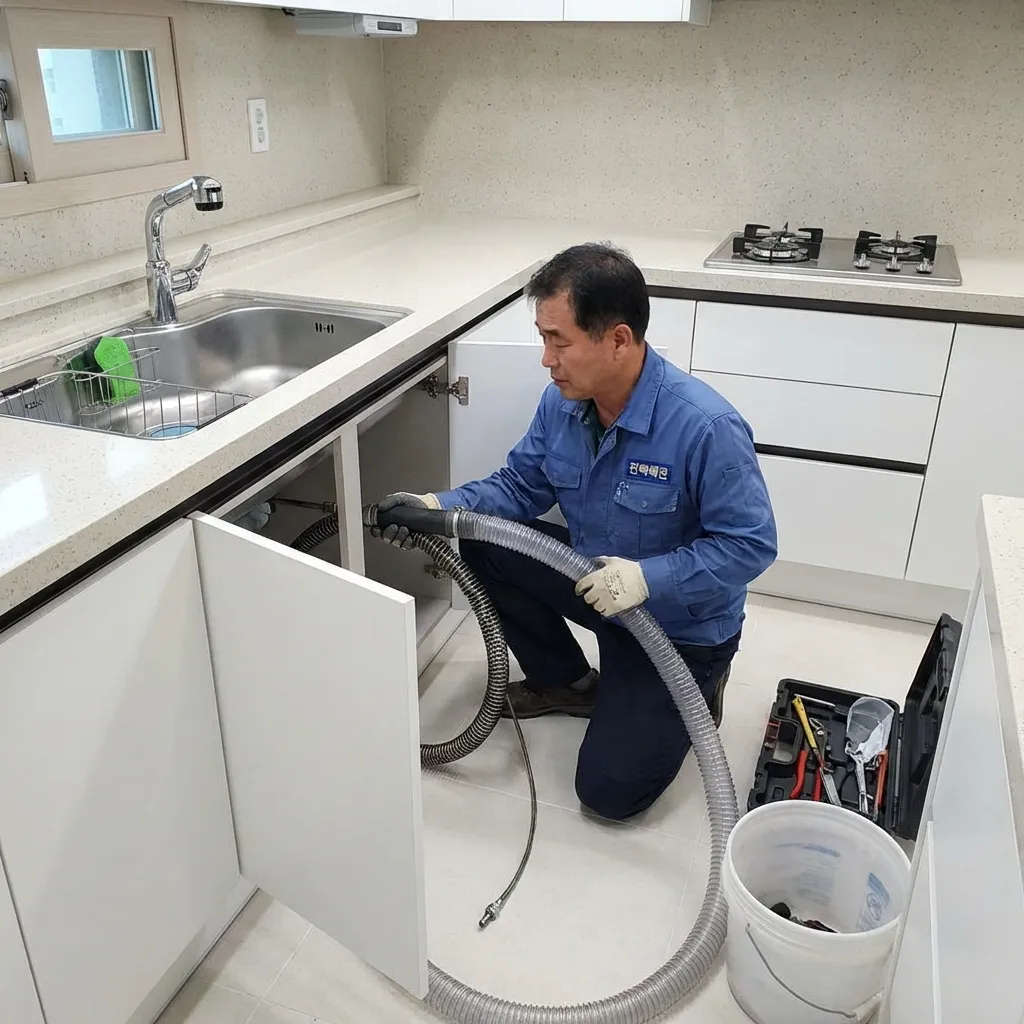 기름때로 막힌 주방 싱크대, 악취까지 한방에 해결! 싱크대막힘 비용 투명한 정찰제.